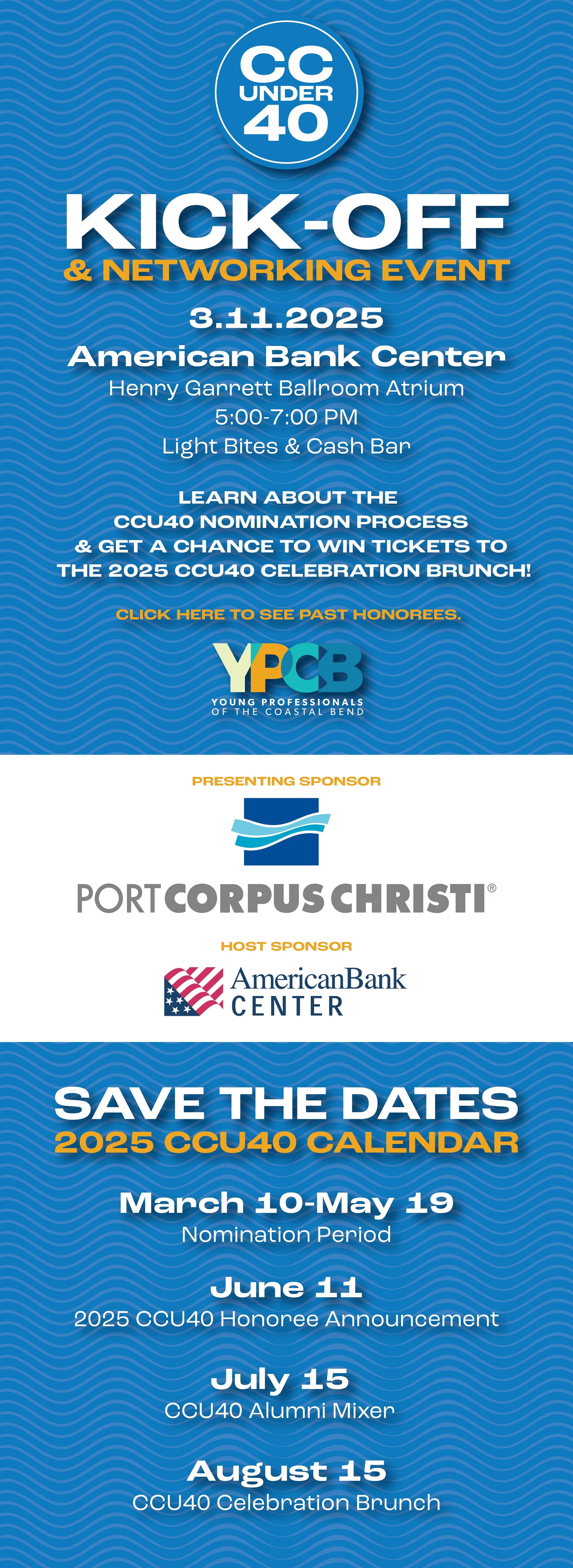 This month's Networking Mixer will be held on Wednesday, June 11 with the announcement of this year's CCU40 Honorees! Join us for an official Mayoral Proclamation and meet this year's recipients along with food, drinks, and photo opportunities. We'll also share details about the CCU40 Brunch Celebration Presented by the Port of Corpus Christi on August 15.